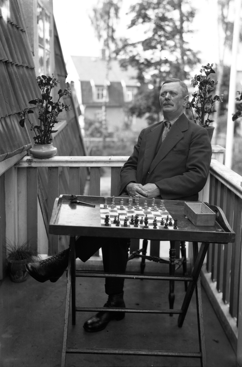 Ernst Holmgren sitter på sin balkong på Presidentgatan 23 i Jönköping. På bordet bredvid sig har han ett schackbräde. Han föddes 6/3 1873 och fick sju barn.