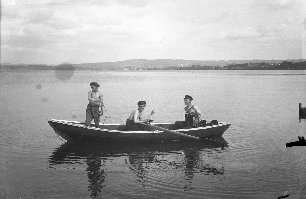 Några kamrater från Högaberg i Jönköping på båttur utanför kanotklubben vid Vätterns västra strand. Från vänster: Olof "Paddock" Jonasson, Yngve Lööv och Gunnar Frisk.