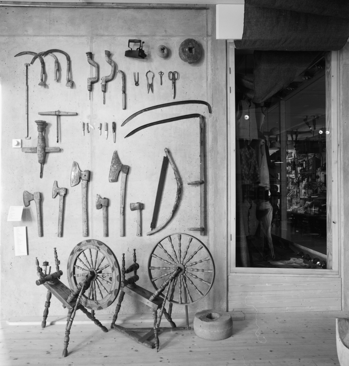 Utställning Tiotusen år. Översikt över utställningsdelen Bondesamhället med bruksföremål från den tiden.