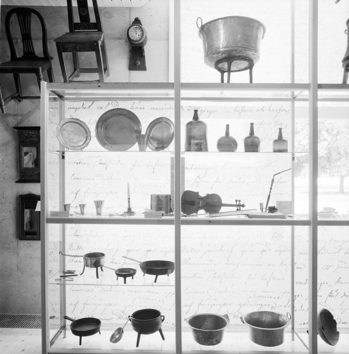 Utställning Tiotusen år. Översikt över utställningsdelen Bondesamhället med bruksföremål.