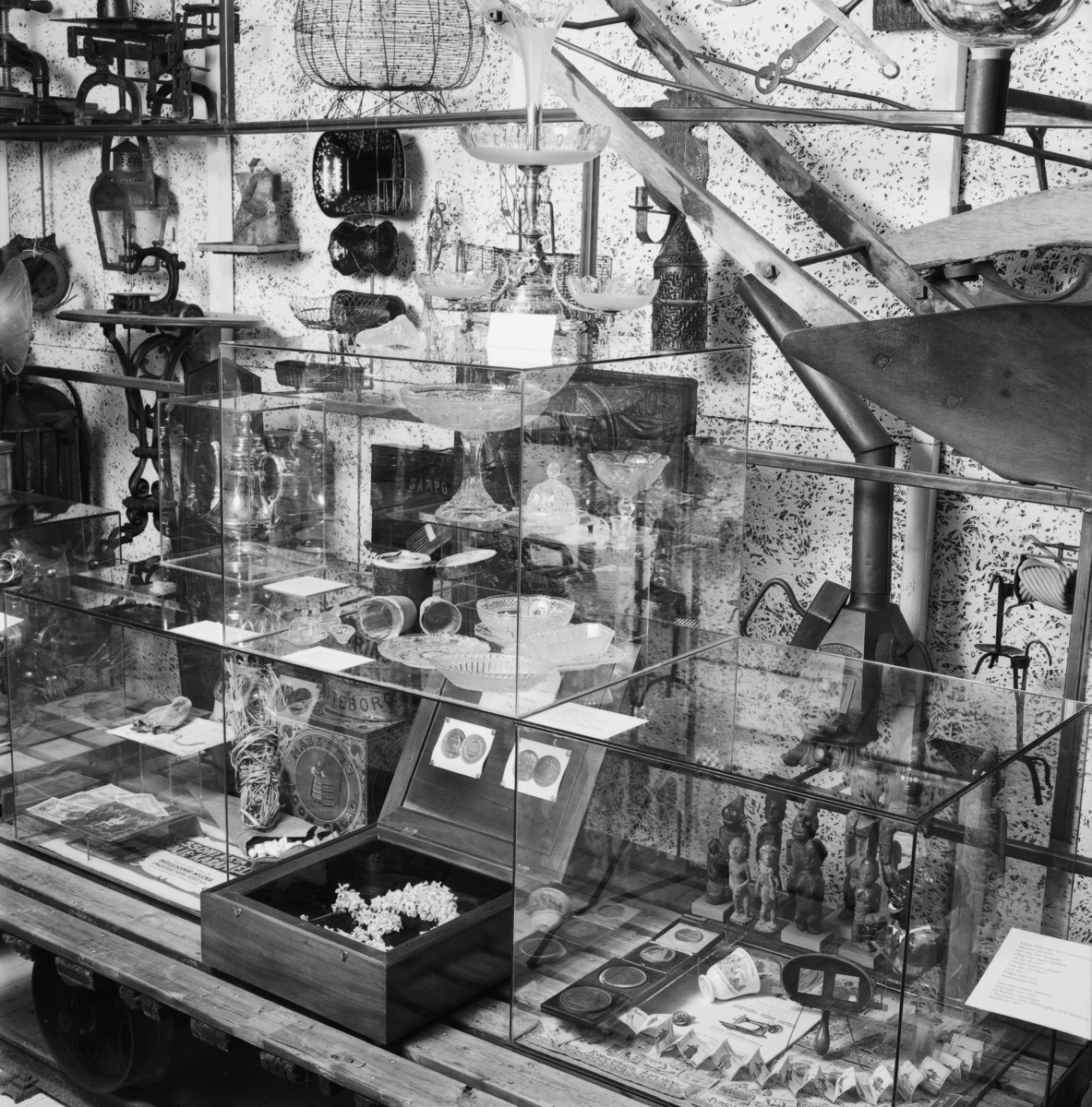 Utställning Tiotusen år. Utställningsdelen "Tågvagnarna" en överblick över glasmontrar 2:1 med statyer från Kongo och glasmonter 2:2 med industripressat glas och monter 2:5 med plåtburk Pellerins margarin.