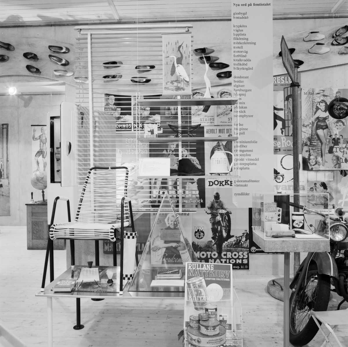 Utställning Tiotusen år. Utställningsdelen 1950-tal med trädgårdsstol och Stringhylla, Häger av trä, Bonad med textiltryck, konserver, TV- kanna och persienner från 1930-talet.