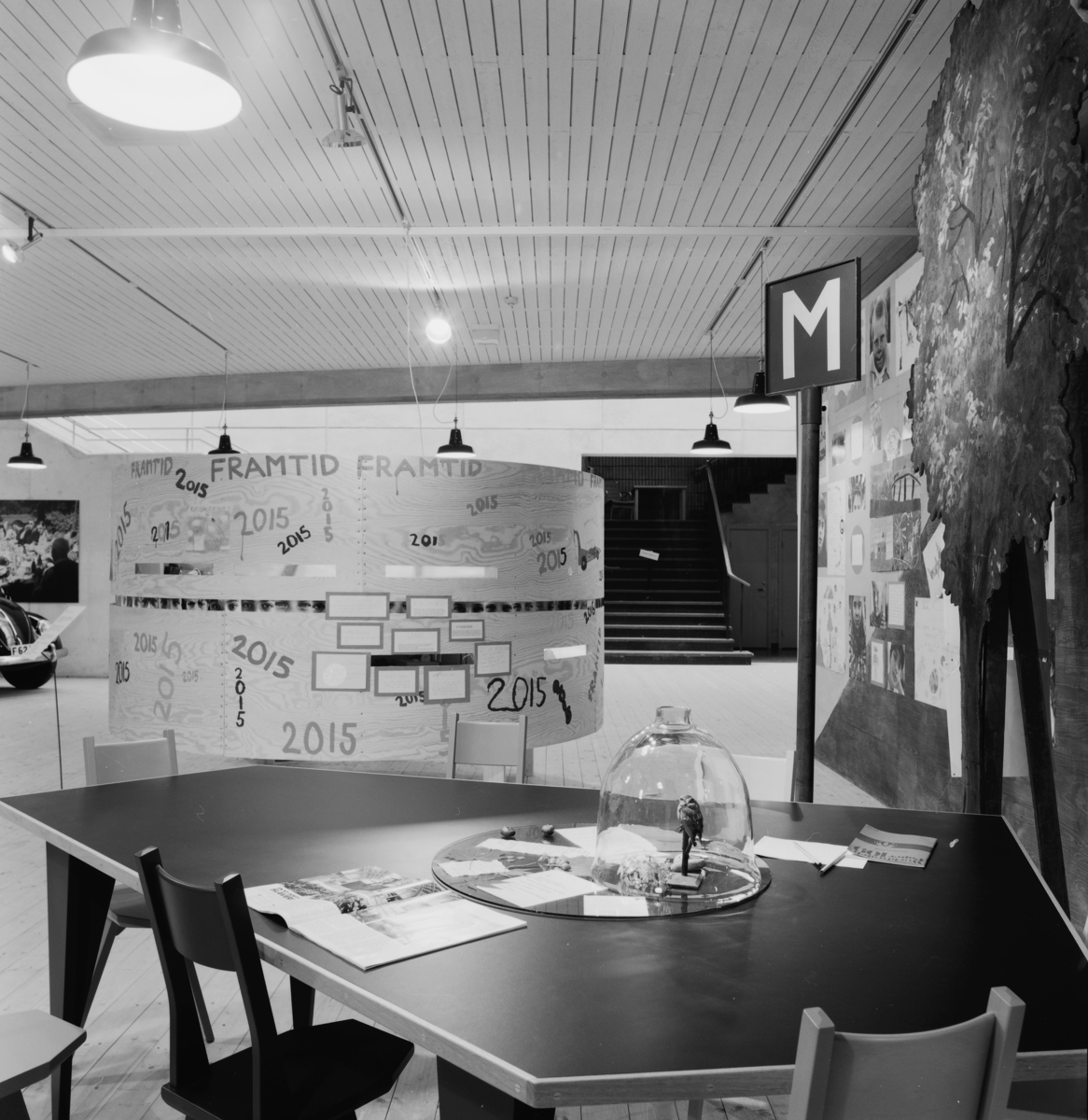 Utställning Tiotusen år. Utställningsdelen mötesplats med en mötesplatsskylt. Överblick över framtidsmonter 2015.
