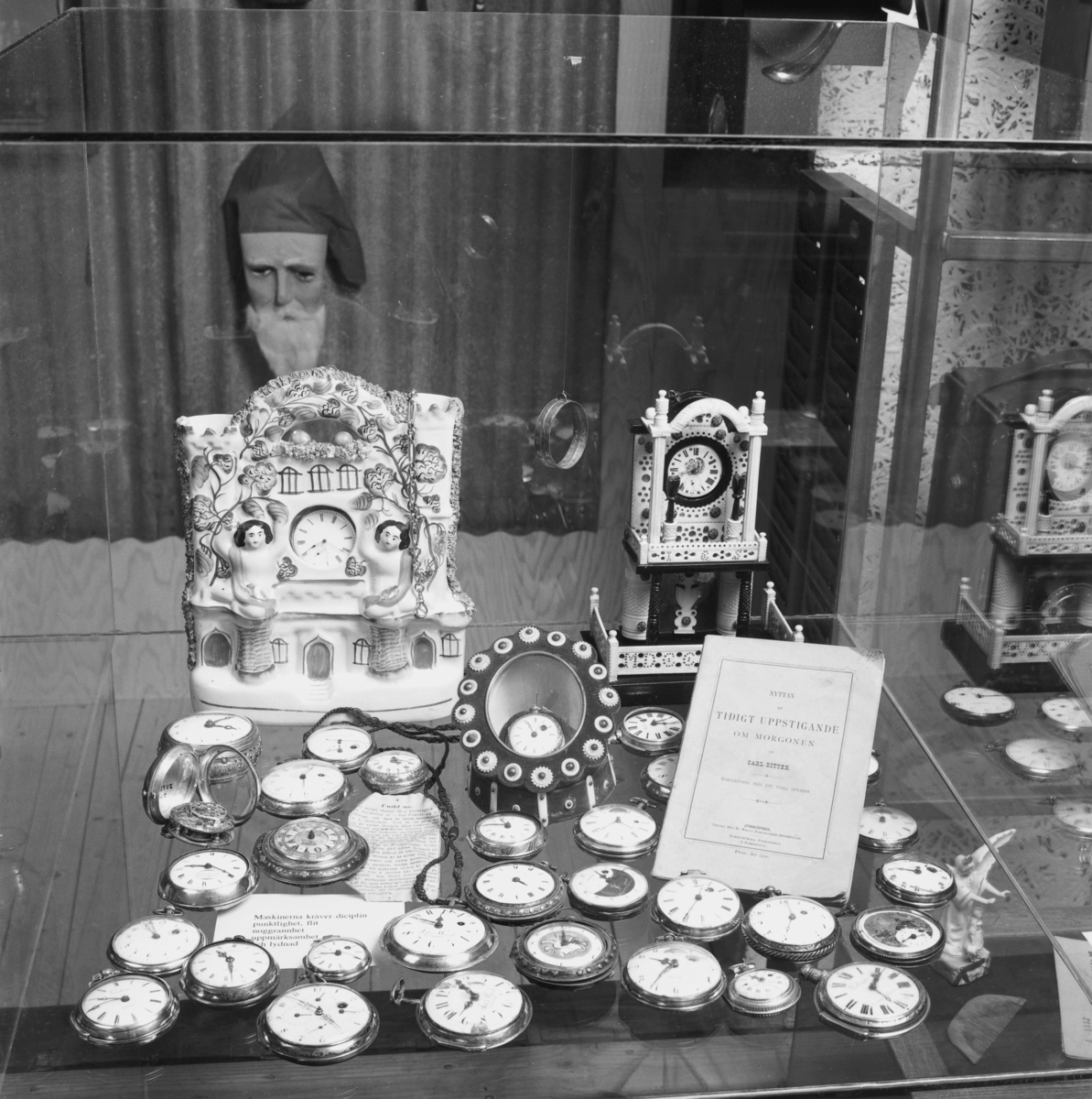 Utställning Tiotusen år. Utställningsdelen Tågvagnarna, glaslåda 5:2 med fickur från 1800-talet, solring solur av mässing, klockställ märkt 1866, klockställ av porslin från Staffordshire, England