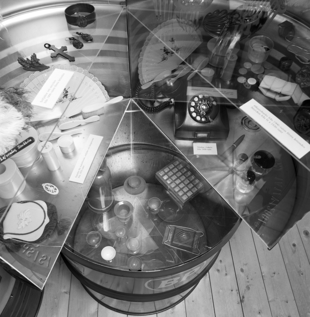 Utställning Tiotusen år. Föremål som presentera i en tunna. På vänster sida Krucifix, svarta örhängen, svart tjockare armband. Solfjäder, borstar och askar. På höger sida telefon från år 1930-1940, senap, salt mått.