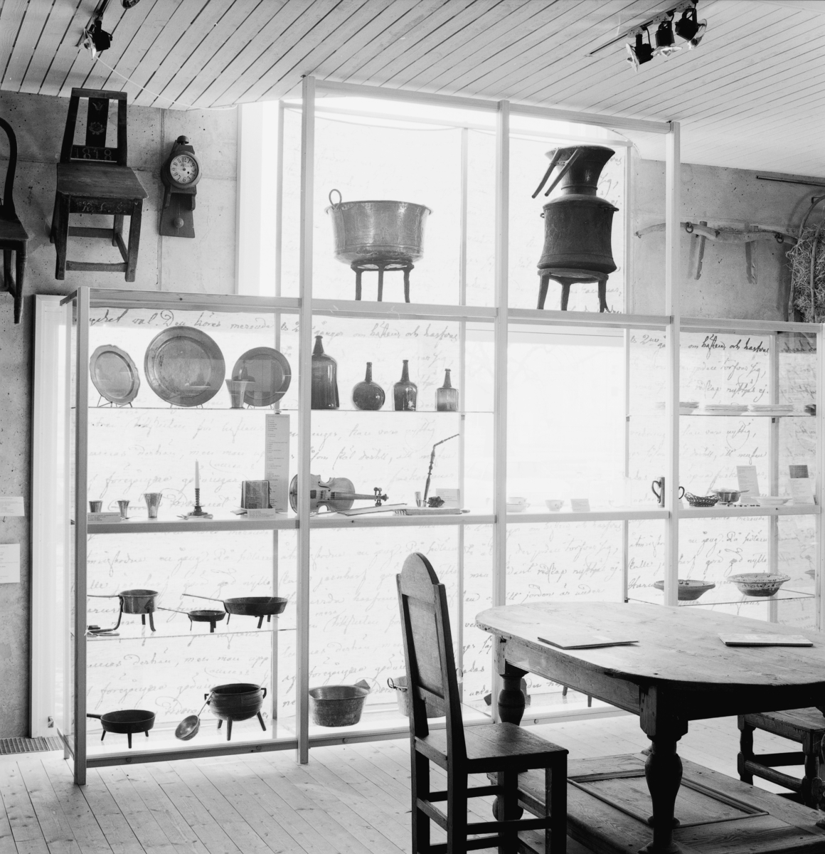Utställning Tiotusen år. Översikt över utställningsdelen Bondesamhället, bruksföremål i hemmet 1800-talet.