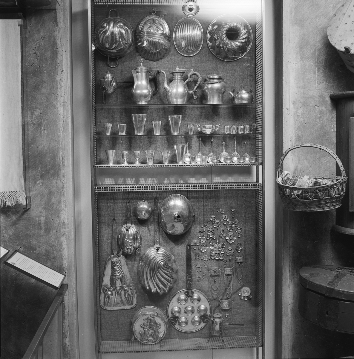 Utställning Tiotusen år. I utställningsdelen Festrummet finns denna monter med olika kannor och formar. I en del visas Folkliga dräktsmycken.