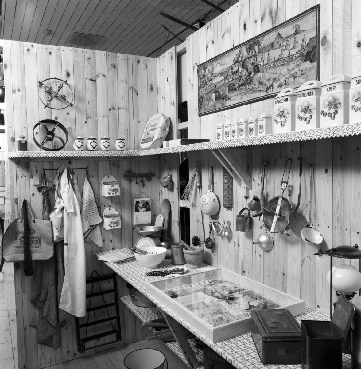 Utställning Tiotusen år. Utställningsdelen skafferiet. Olika föremål som ingick i ett skafferi, på väggen olika hushållsredskap och en liten hylla med olika kryddburkar.