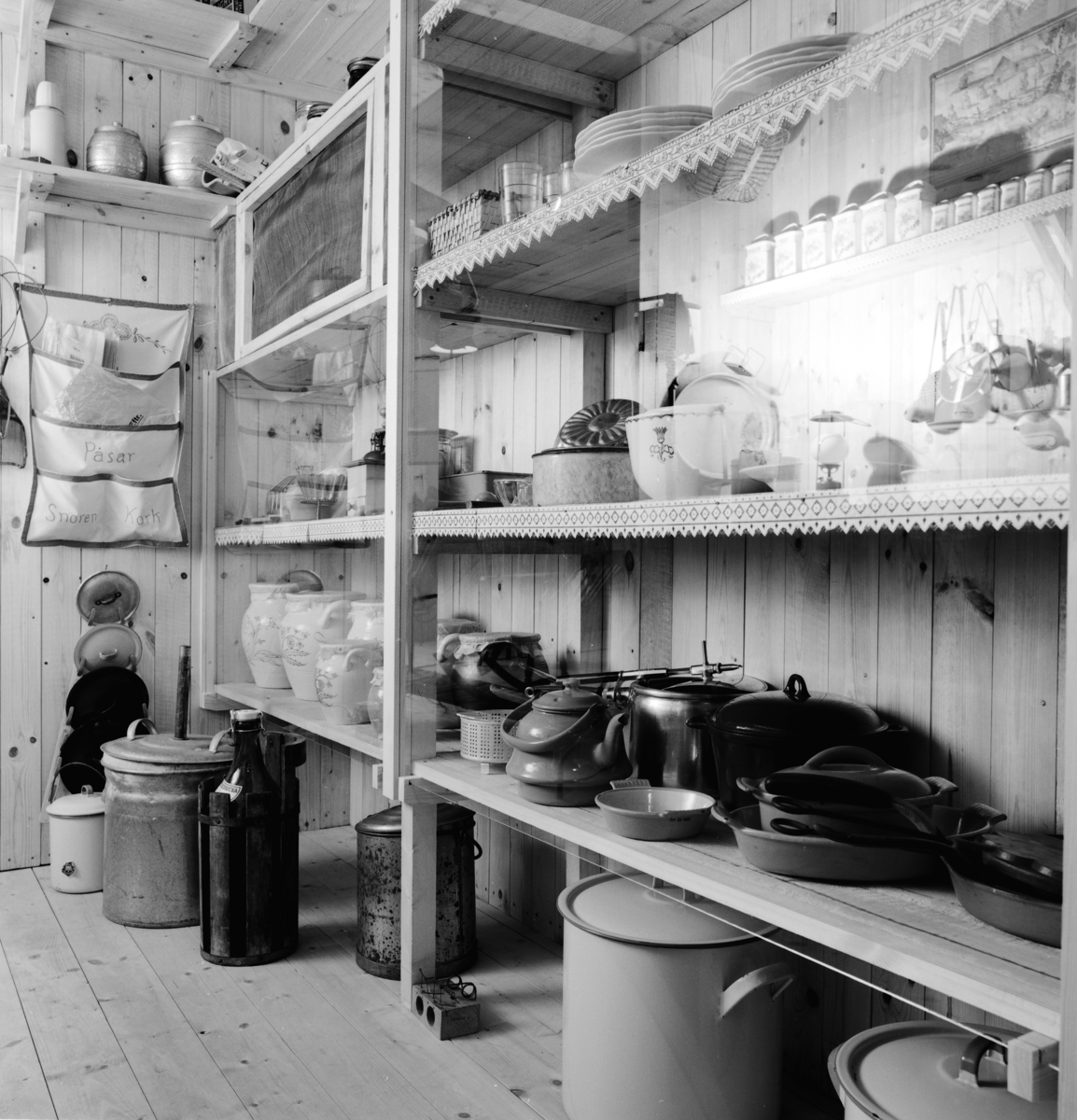 Utställning Tiotusen år. Utställningsdelen skafferiet med olika hushålls föremål. Hyllor med grytor och olika krus. På väggen sitter en förvaring i tyg för påsar, snören med mera.