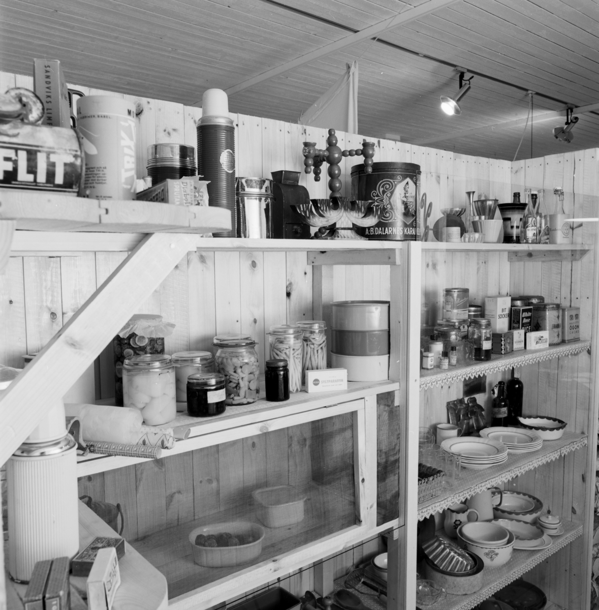 Utställning Tiotusen år. Utställningsdelen skafferiet med hyllor fyllda av det som ingick i ett skafferi för i tiden. På översta hyllan står ljusstakar, vaser,kaffekvarn med mera.