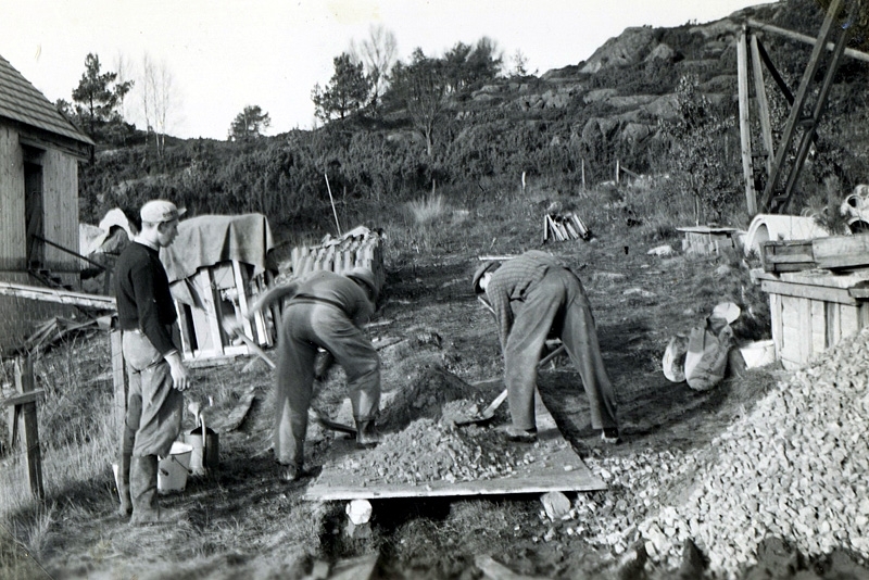 Färåsvägen 45, Hallen i Kållered år 1954. Till vänster (i keps) Bo Ericson som byggde huset och flyttade in med hustrun Astrid.