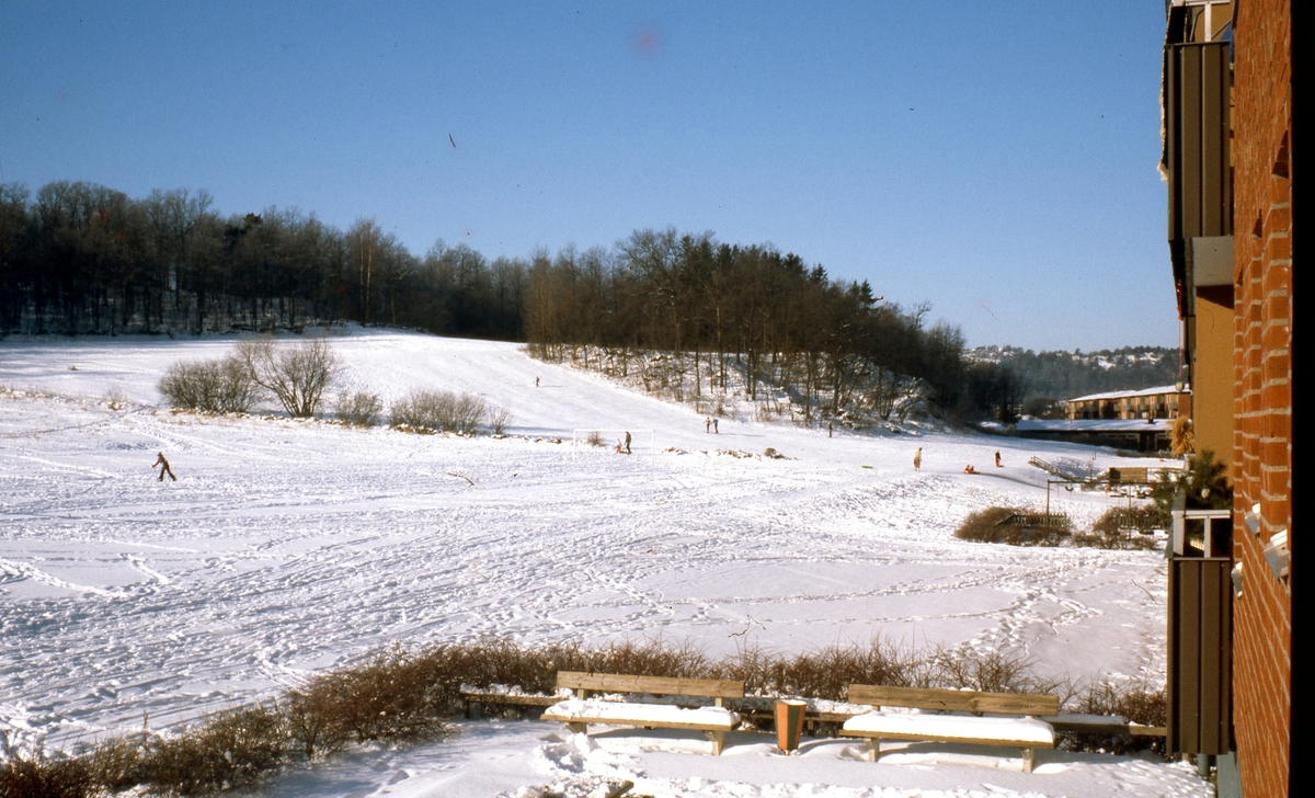 Vy från balkong på Vommedalsvägen, där människor åker pulka och skidor vid Himlabacken (ner från Kållereds kyrka) i Vommedal, cirka 1975. Där ligger idag Vommedals näridrottsplats.