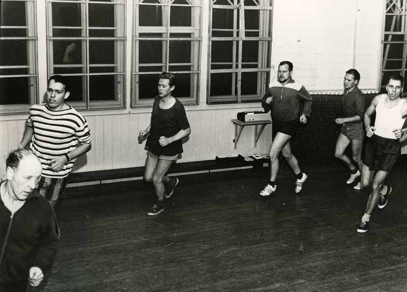 Herrar i Kållereds gymnastikförening motionerar i Stretereds gymnastiksal, 1960-tal. Ledaren Sven Olof Andersson (1924 - 2012) ses längst till höger i vit tröja.