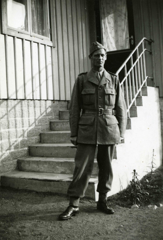 Uniformsklädde skräddaren Carl Eliasson (1903 - 1990) framför sitt hus, Bölet 2:9 "Skogsgläntan" Bergsjövägen 6, 1940-tal.