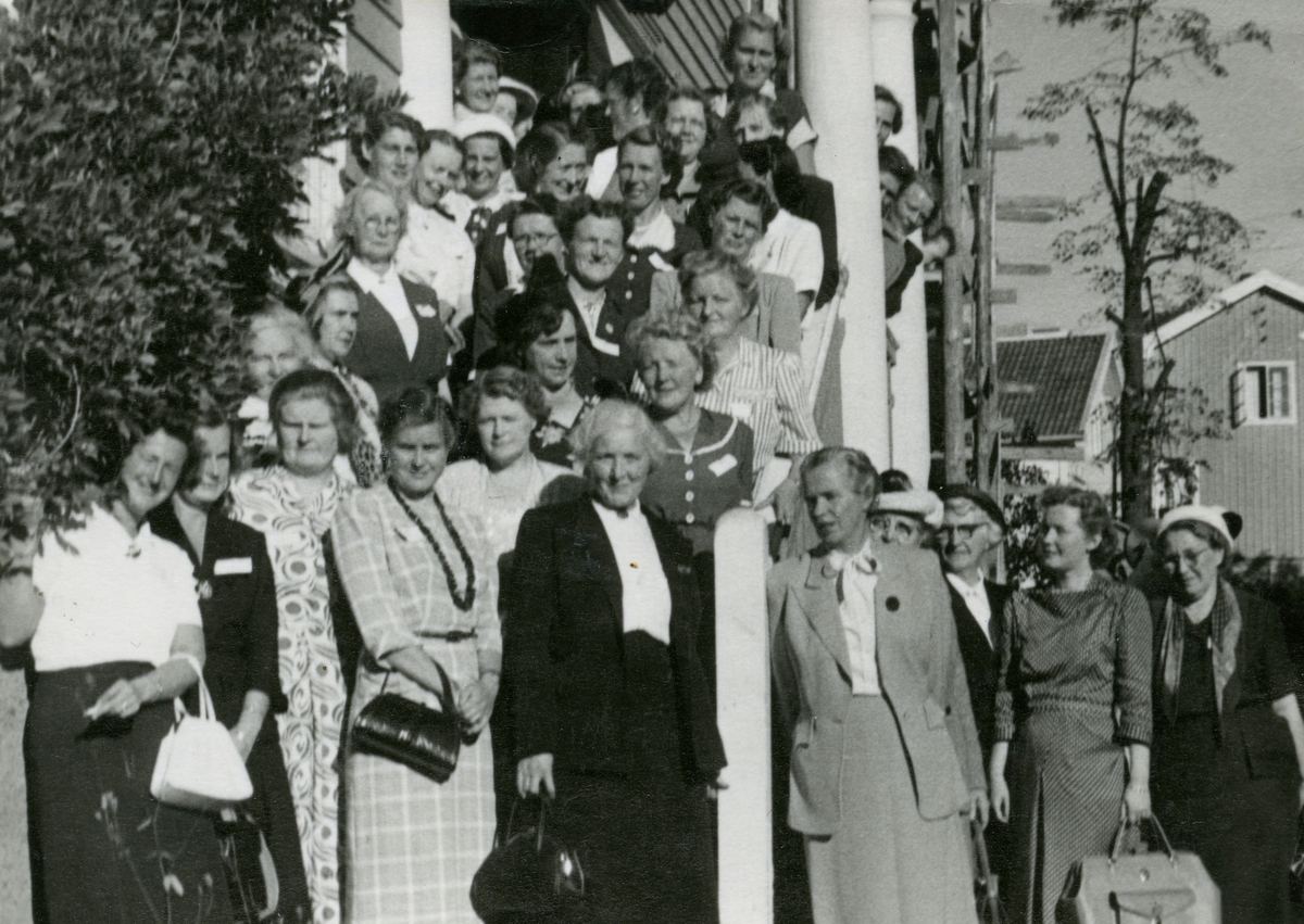 Kvinnligt Folkpartimöte i Ljungskile (eller Kungälv), 1950-tal. Längst upp i mitten står Stina Svensson (1912 - 2001) som var Fp*-politiker både i Kållered och Mölndal.