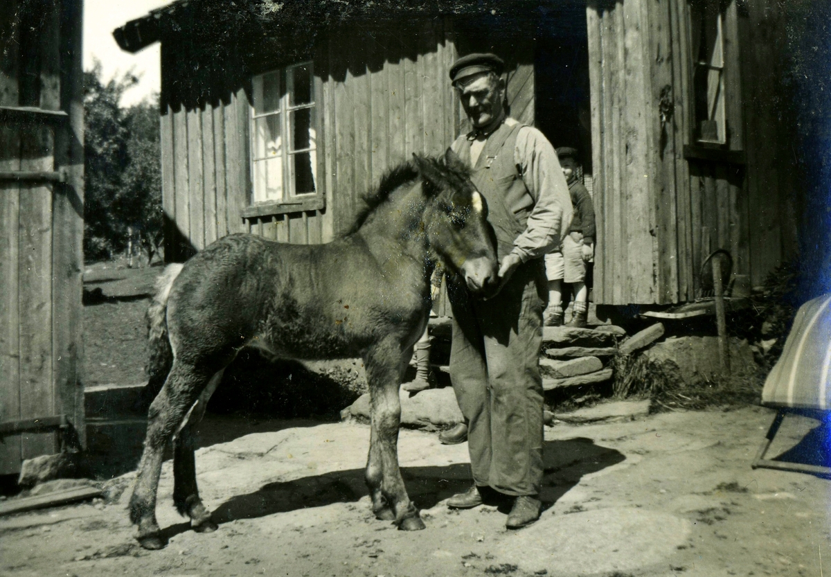 Edvin Bengtsson (1880 - 1969) med ett litet föl, Långåker 1:3 "Natanaels" okänt årtal.