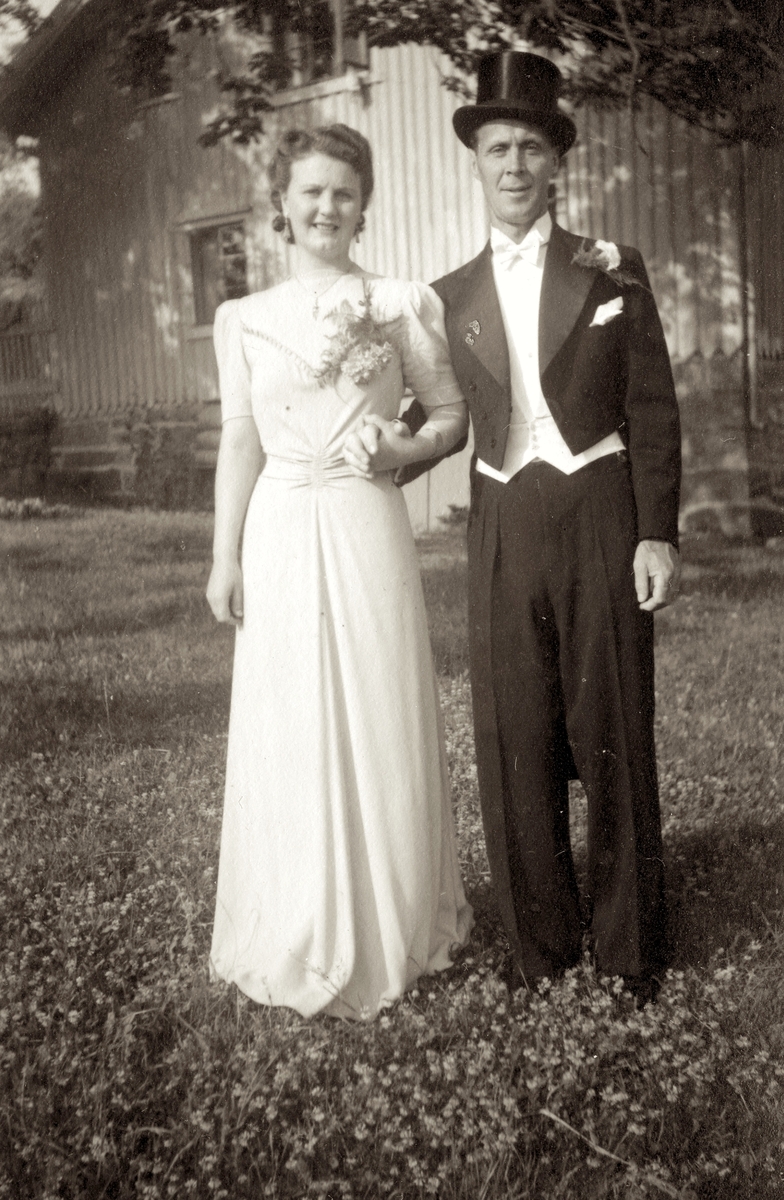 Bröllop år 1942 mellan Ingrid Andersson (1918 - 2001) och Sven Skansing (1906 - 1999). Livered "Majas" ses i bakgrunden.