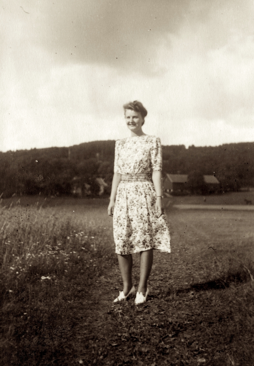 Ingrid Andersson (1918 - 2001, gift Skansing) står på en grusväg cirka 1940. Gården Livered "Majas" ses i bakgrunden.