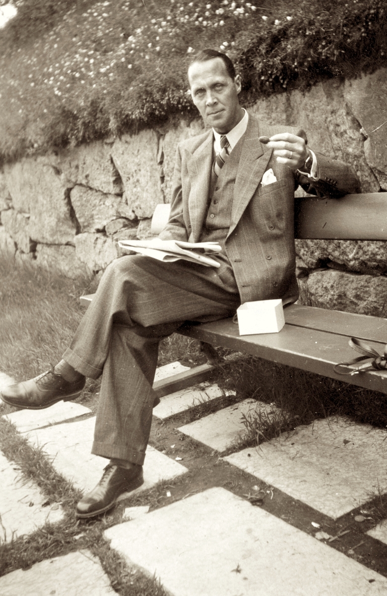 Sven Skansing (1906 - 1999) är på utflykt till Göteborg och sitter på en bänk, början av 1940-talet.
