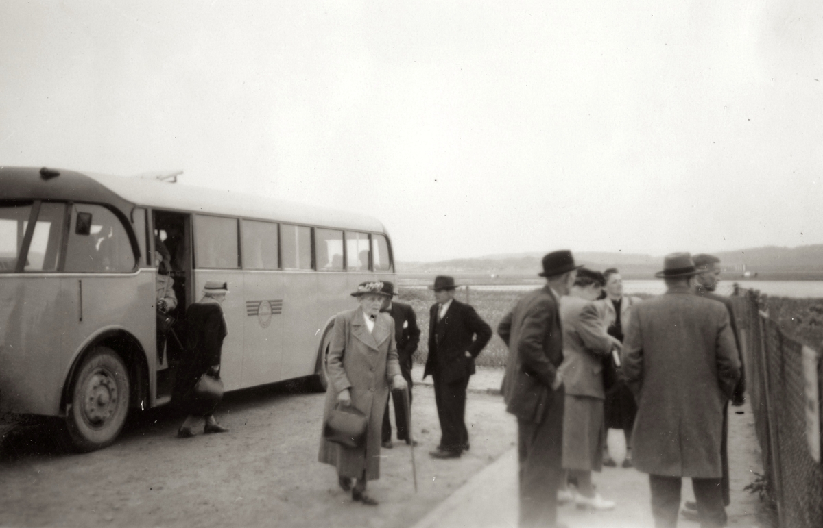 Kållered Missionsförsamlings syförening är på utflykt med Kålleredsbussarna, 1940 - 50-tal. Relaterade motiv: A2412, A2414.