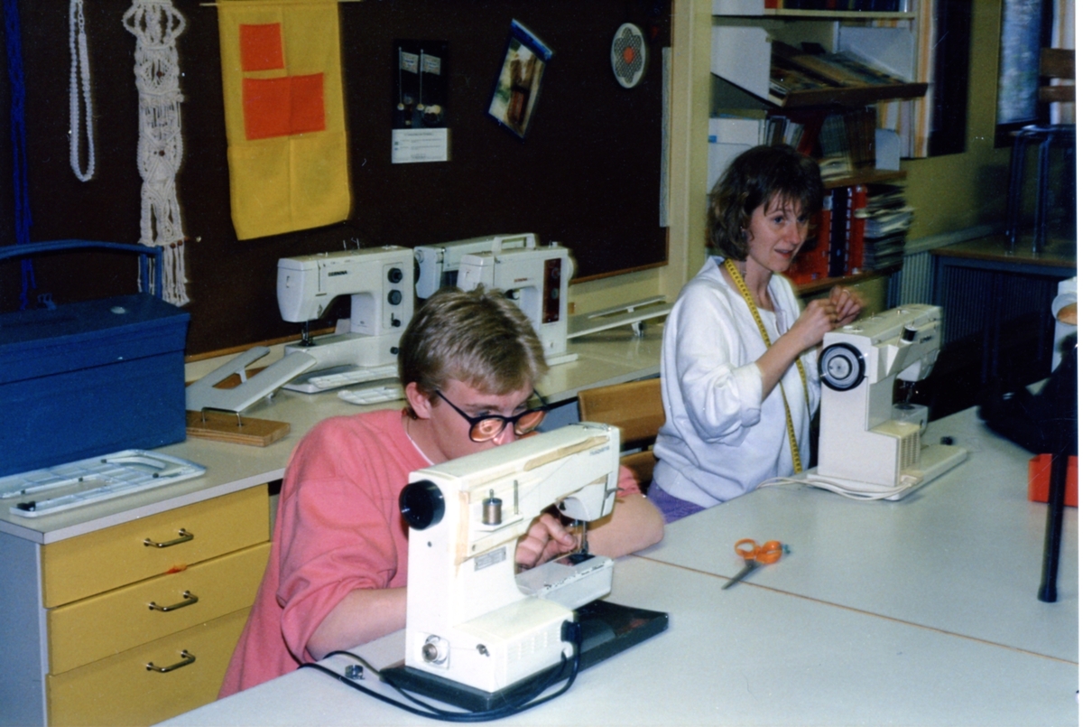 Klädsömnad inför Bygdespelet "Brandskatten", okänd lokal år 1986. Från vänster: Okänd man samt projektledare Eva Ågren (från Studieförbundet Vuxenskolan) sitter och syr.