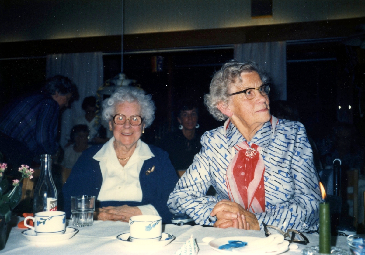 Fikastund på Brattåsgården, cirka 1990. Från vänster: Astrid Sundfeldt (1921 - 2009) och Elsa Andersson (1909 - 2000).