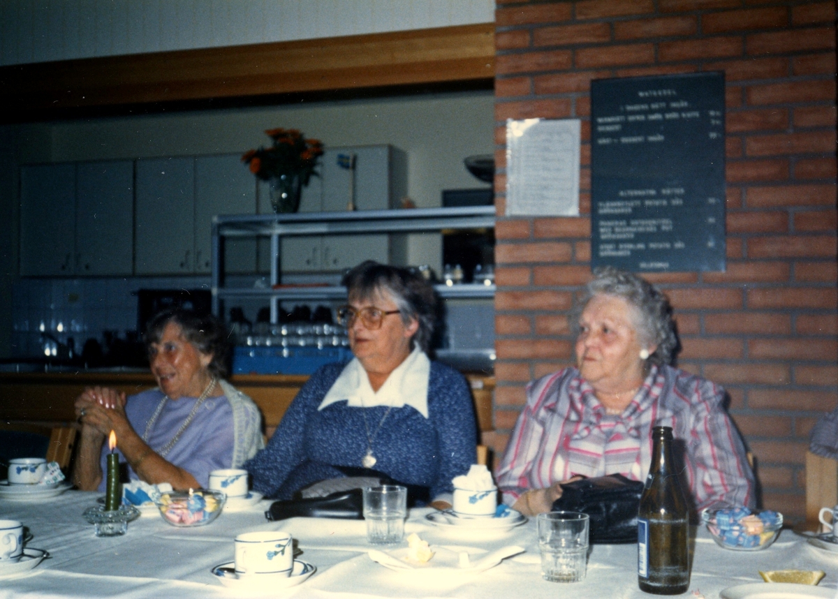 Tre kvinnor sitter till bords i Brattåsgårdens matsal, cirka 1990. Från vänster: Gunvor Johansson, Barbro Johansson och okänd.