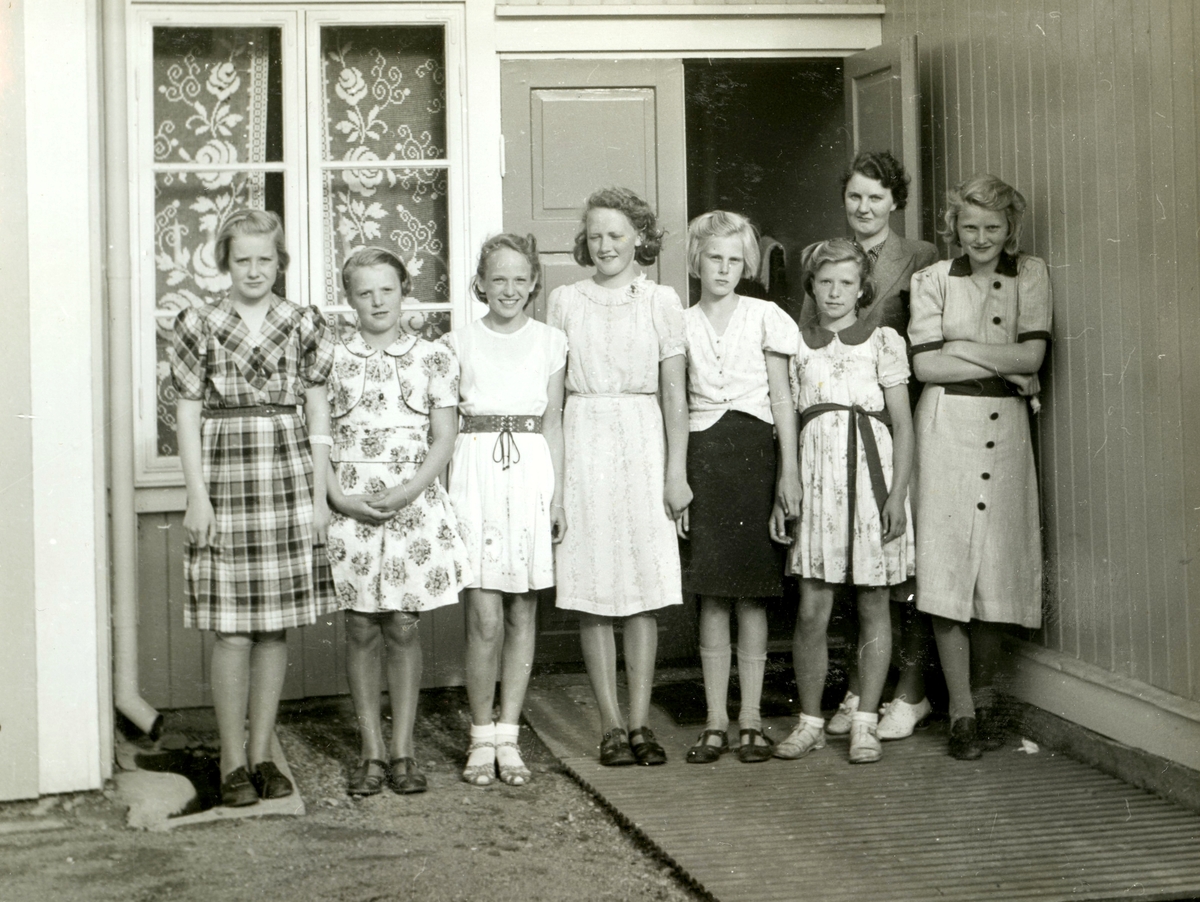 Dalsland/Värmland år 1937. Elever och lärare från Kållered är på skolresa. Vid dörren står Ingrid Andersson (1918 - 2001, gift Skansing) som var medhjälpare på resan. Skolresan gick genom Dalsland/Värmland till den norska gränsen och anordnades av Daga och Gunnar Alander (folkskollärare i Kålleredsskolan).