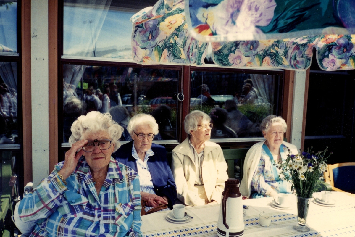 Fyra kvinnor sitter och fikar i solen utanför Brattåsgården (Streteredsvägen 5), cirka 1990. Från vänster: Daga Ahlander (1905 - 1996), Rut Göransson (1905 - 1999), Edit Bernhardsson (1911 - 2000) samt Agnes Eliasson (1904 - 2002).