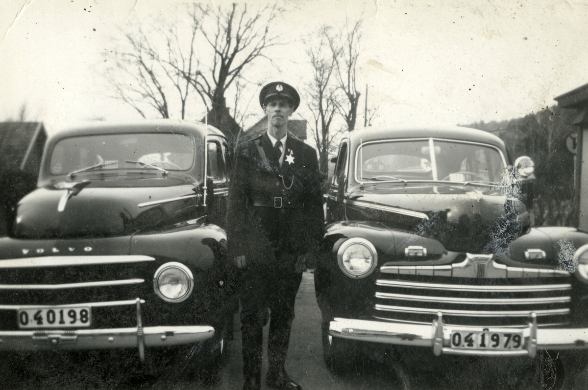 Fritiof (elev boende på Stretereds skolhem) iförd polisuniform, står mellan två taxibilar vid Kållered station, 1940-tal. Han fick "hjälpa" polisen ibland. Taxistationen skymtas till vänster. Relaterat motiv: A2301.