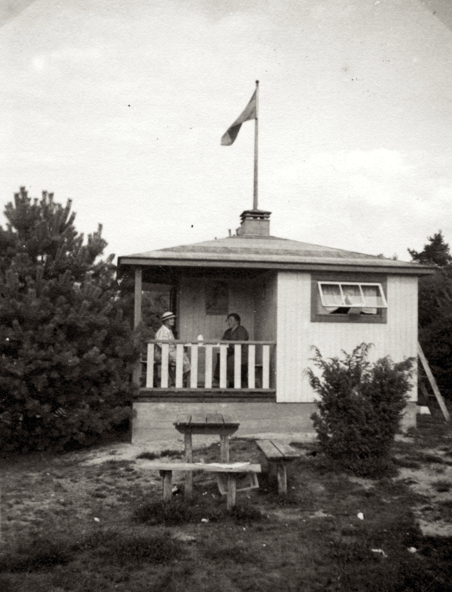 Nora Krantz (till vänster i vit hatt) och en okänd person sitter och fikar på Tulebokioskens veranda, 1930-tal. Utanför byggnaden står två träbänkar vid ett bord. På kioskens tak sitter en vimpel.