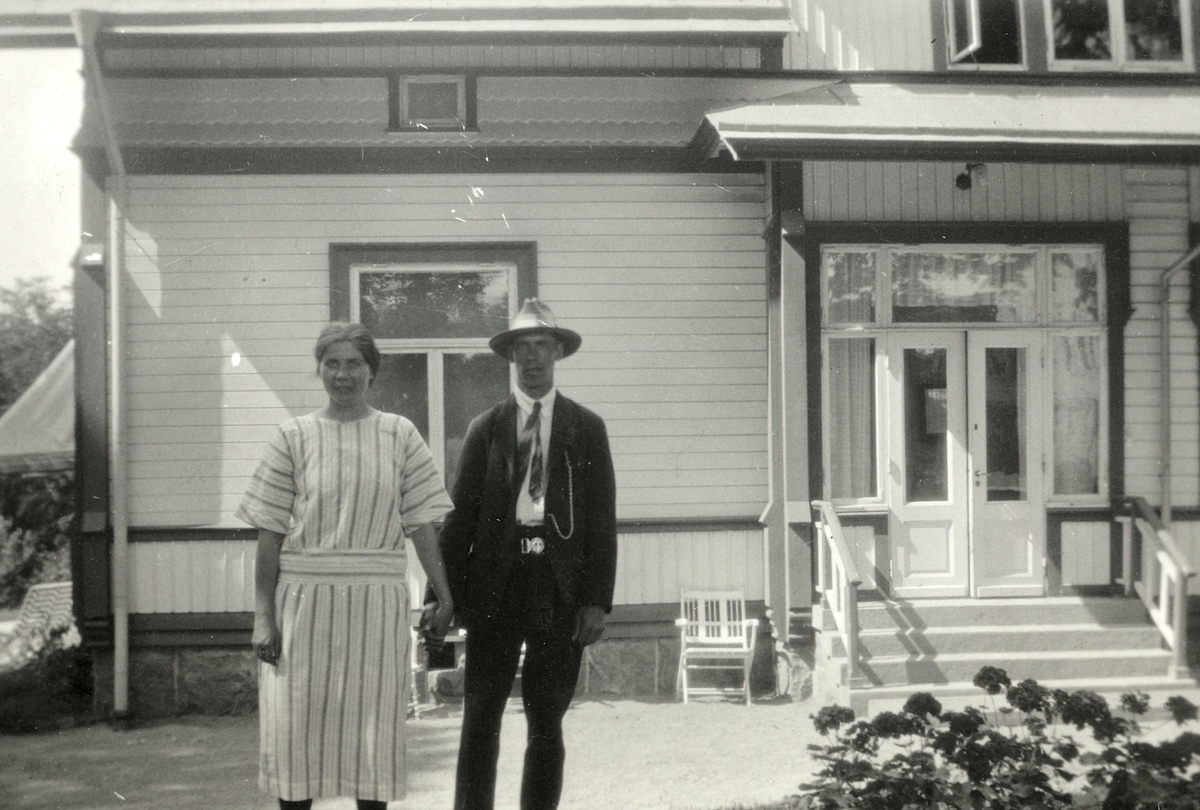 Rut och Fritiof (elev boende på Stretereds skolhem) håller varandra i händerna, ståendes utanför rektorsbostaden i Stretered, 1930-tal.