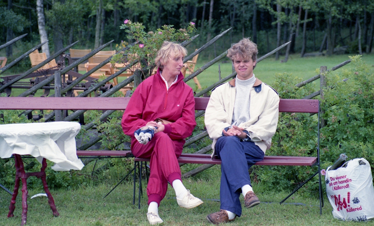 Troligtvis gökotta vid Hembygdsgården Långåker 1:3, 1980-tal. Eva Ivarsson och Robin Johansson sitter på en bänk utomhus. Till höger står en plastpåse från Obs! som senare blev Coop.