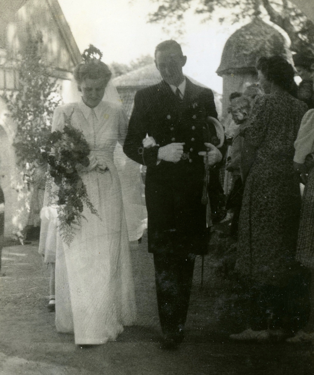 Bröllop mellan Nellie Gustafsson (1919 - 1993) och Eivind "Eje" Kullbring (1918 - 1996) som vigdes i Kållereds kyrka 1942-06-23. Paret vandrar på grusgången från kyrkan under tiden som det kastas ris på dem.