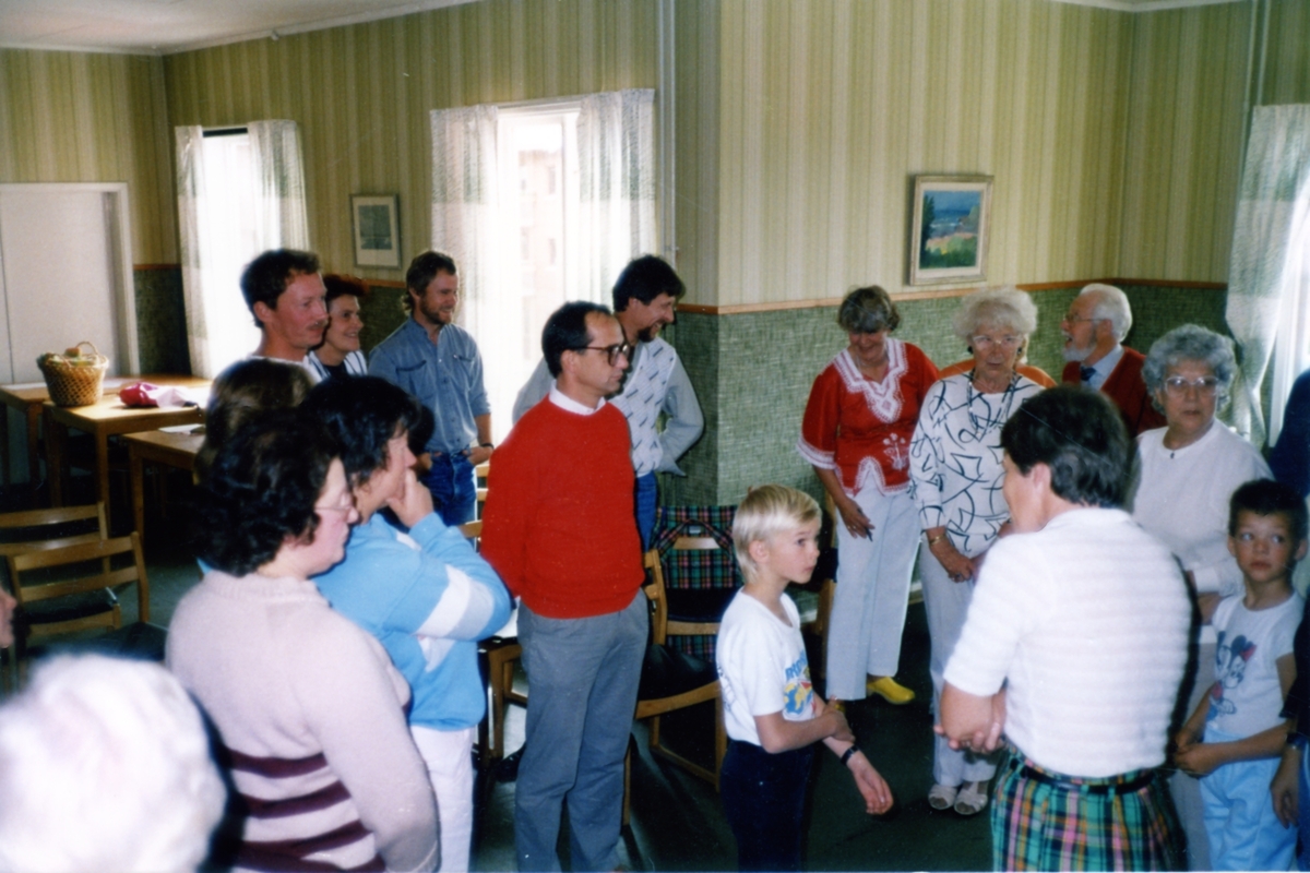 Repetition inför Bygdespelet "Brandskatten", A-salen i Kållereds Kommunalhus (Streteredsvägen 3) 1986/87. I mitten står (man i röd tröja och glasögon) Åke Persson.