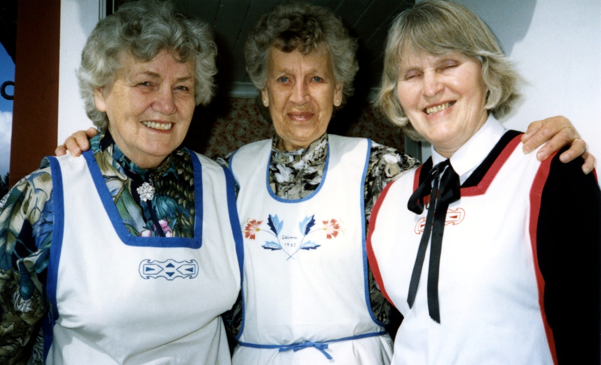 Tre kvinnor iklädda förkläde, står vid ingången till boningshuset Hembygdsgården Långåker 1:3, 1980-tal. Från vänster: Inga-Maj Carlsson (1920 - 1999, Vommedal), Stina Svensson (1912 - 2001, Vommedal) och Emy Johansson (Torrekulla).