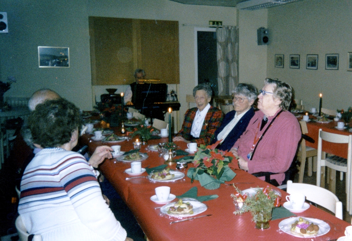 Julkaffe för äldre medlemmar i Kållereds PRO-lokal på Gamla Riksvägen 44 (Värdshuset), 1990-tal. Okända personer till vänster. Från höger: Sigrid Börjesson (i rutig kavaj), Anna-Lisa Larsson samt okänd kvinna.