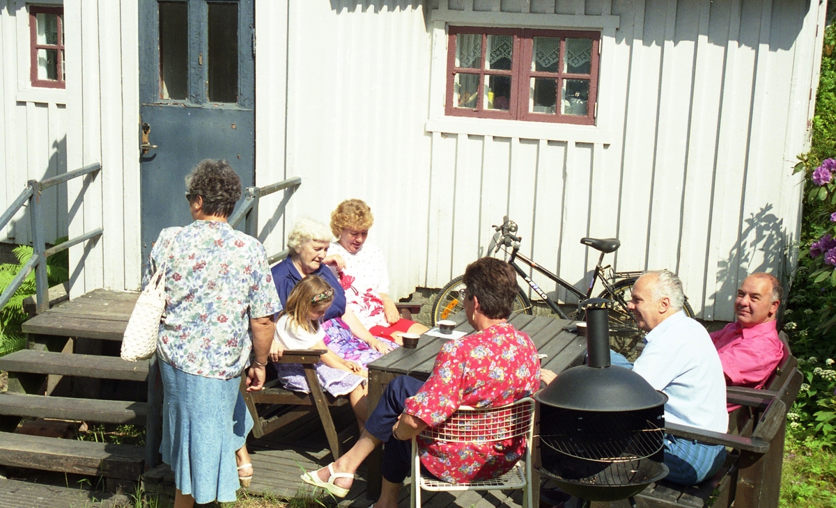 Invigning av Ekebackens Hantverksgård (tidigare John Lindströms möbelsnickeri) på Gamla Riksvägen 81, början av 1990-talet. Besökare sitter och fikar utanför "Lillstuga".