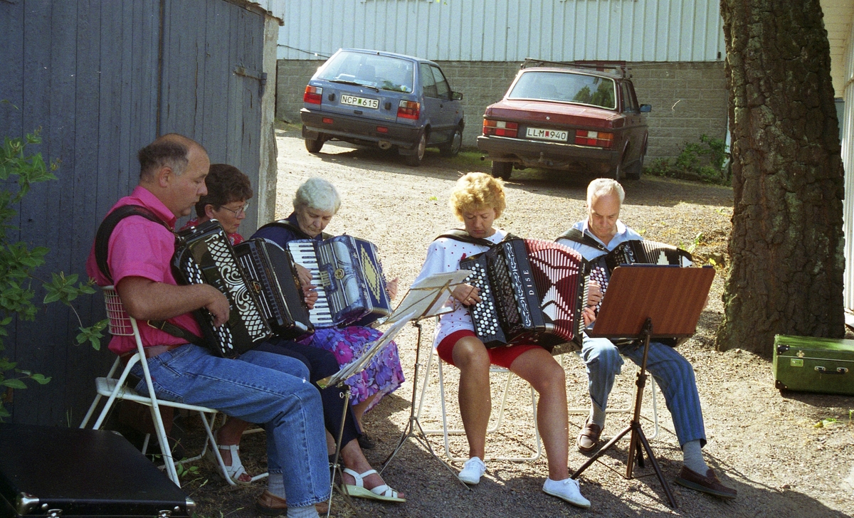 Köksorkestern spelar dragspel vid invigningen av Ekebackens Hantverksgård (tidigare John Lindströms möbelsnickeri) på Gamla Riksvägen 81, början av 1990-talet.