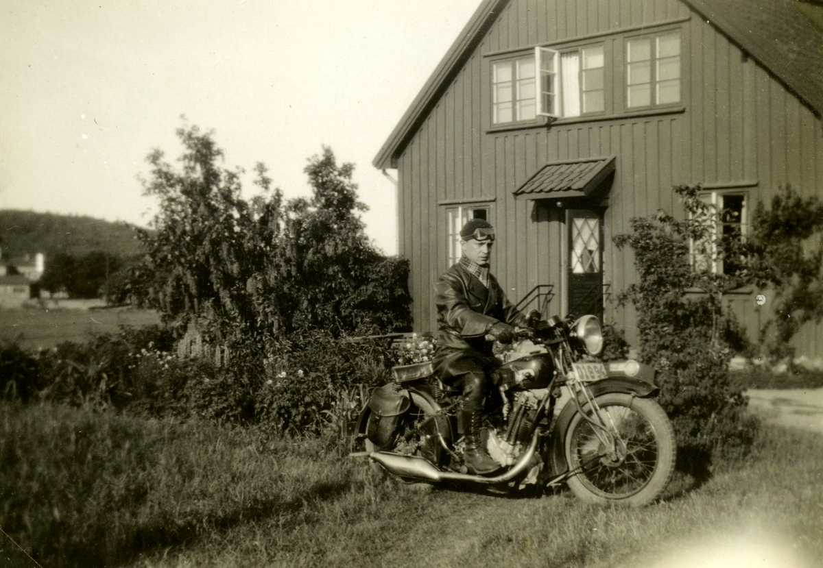 Östen Krantz (1910 - 1990) sitter på sin BSA-motorcykel utanför föräldrahemmet, cirka 1930. Föräldrarna Nora och Carl Krantz var båda anställda på Stretered och huset var deras personalbostad på Tulebovägen 23-27. Byggnaden finns kvar och ligger i backen ner mot Tulebo badplats. På vänster sida ses badplatsen till höger.