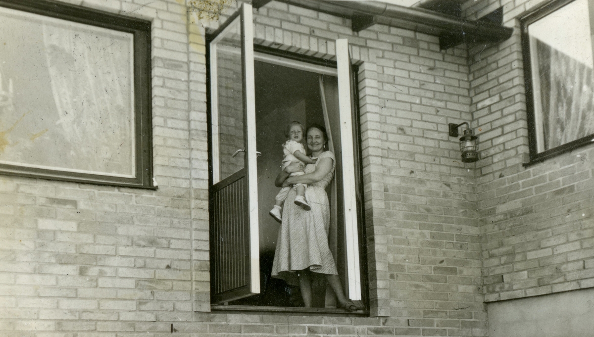 Mary Ekman håller sonen Manne (född 1955) i famnen, april 1957. De står i balkongöppningen till familjens nybyggda villa (då utan trappa och altan), Villa Maribo på Streteredsvägen 29.