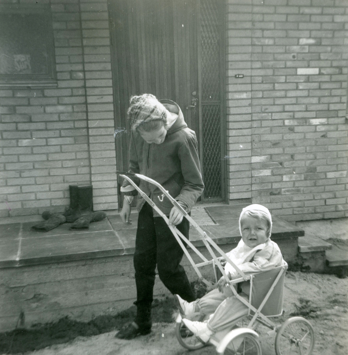 Kusin Ingela är på besök hos sin lille kusin Manne Ekman (född 1955) som sitter i en sulky utanför Villa Maribo (Streteredsvägen 29) våren 1957.