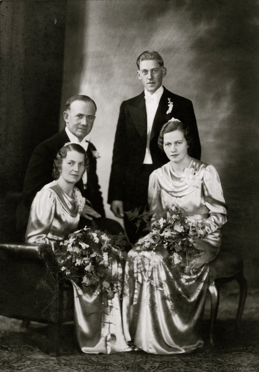 Dubbelbröllop för systrarna Ingeborg och Astrid Gustavsson, Kållered 1936-11-29. Till vänster: Ingeborg Gustavsson (1901 - 1987), Nygård i Kållered och John Johansson, Backen (1898 - 1966).