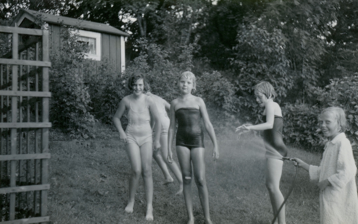Tre flickor duschas med en trädgårdsslang av Karin Pettersson (född 1947, gift Hansson) på Gamlehagsvägen 17 i Torrekulla, år 1954. Från vänster: Barbro Lundberg, Inger Svensson, Eva Pettersson (född 1944, gift Kempe). Okänd som springer i bakgrunden.