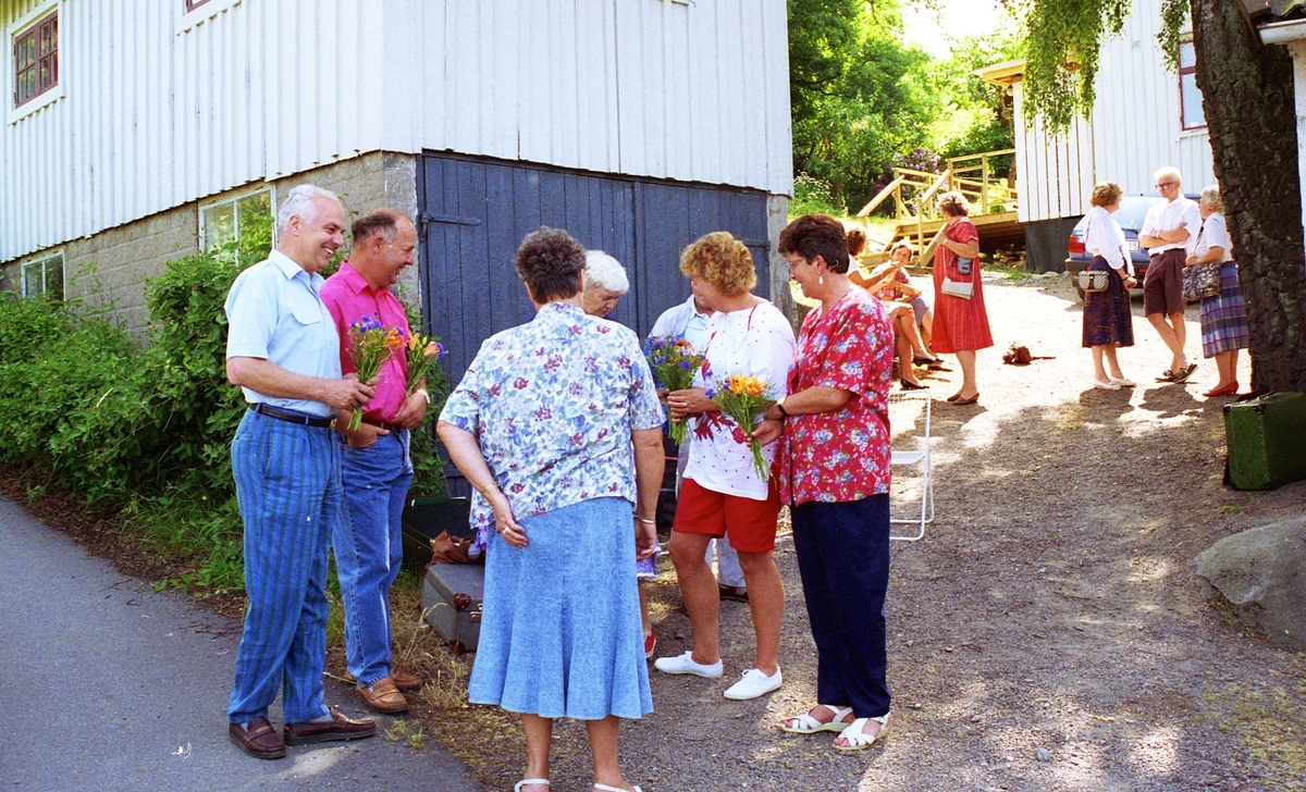 Invigning av Ekebackens Hantverksgård (tidigare John Lindströms möbelsnickeri) på Gamla Riksvägen 81, början av 1990-talet. Gun Flygare från Vuxenskolan (i blå kjol) avtackar Köksorkestern med blommor. Till höger (i röd blus) står Asta Axelsson (Vommedal).