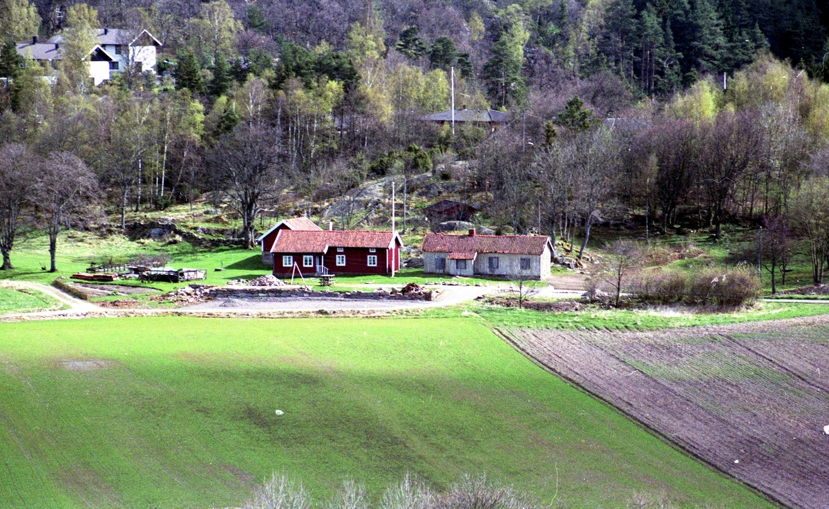 Gårdarna i Långåker, fotograferade med teleobjektiv från Labackaåsen cirka 1980 - 1990. Till vänster Hembygdsgården Långåker 1:3 och till höger Långåker 1:2 "Davids", "Derras". Längst upp till vänster ses villor på Färåsvägen.