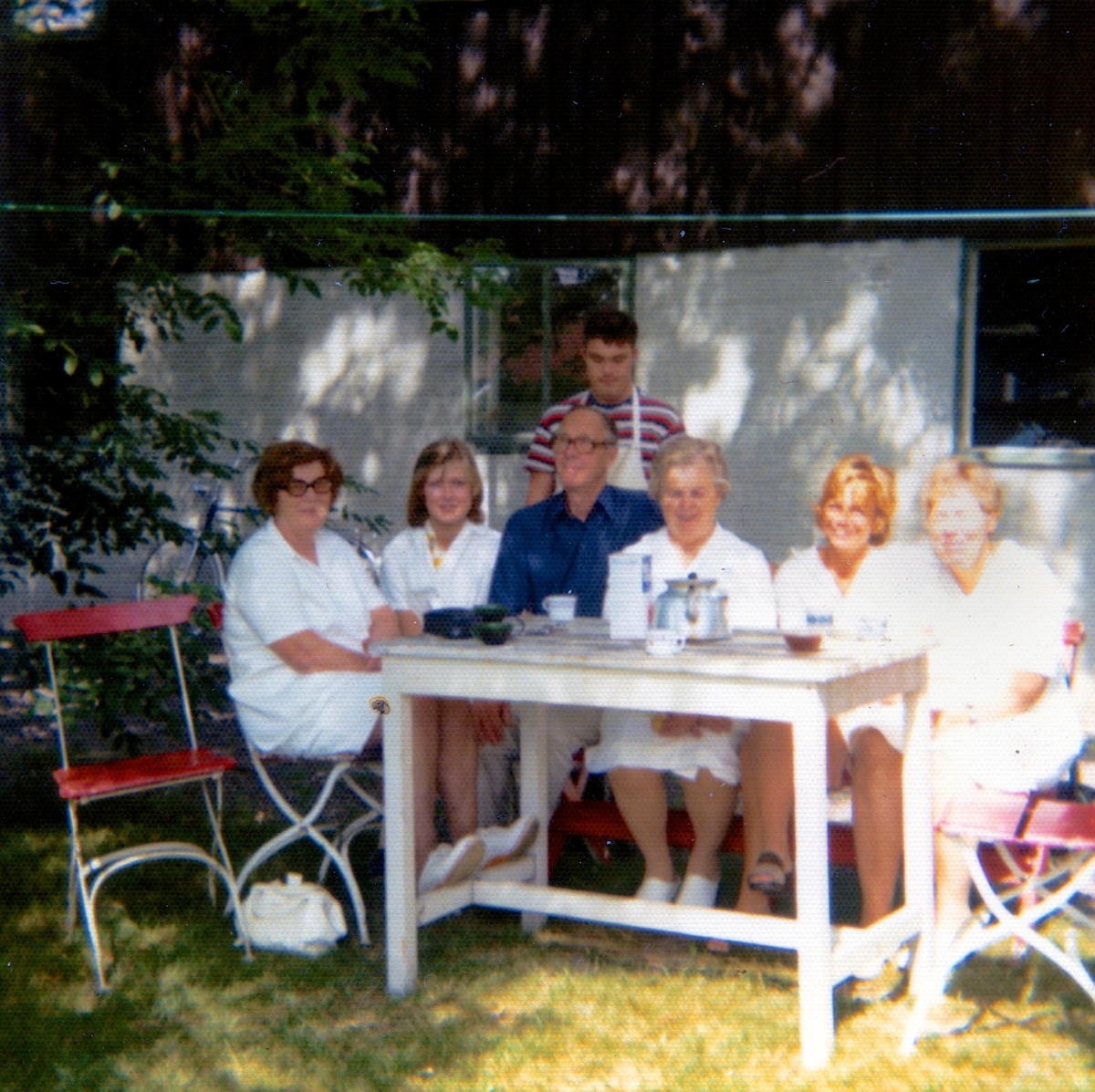 Kafferast utanför entrén till Kållereds Tvätt (Kållereds-Tvätten) på Streteredsvägen 36 B, 1960-tal. Från vänster: 1. Okänd kvinna. 2. Okänd kvinna. 3. Sven Skansing (1906 - 1999). 4. (bakom Sven) Okänd man. 5. Anna. 6. Okänd kvinna. 7. Okänd kvinna. Relaterade motiv: A0956 - A0958.
