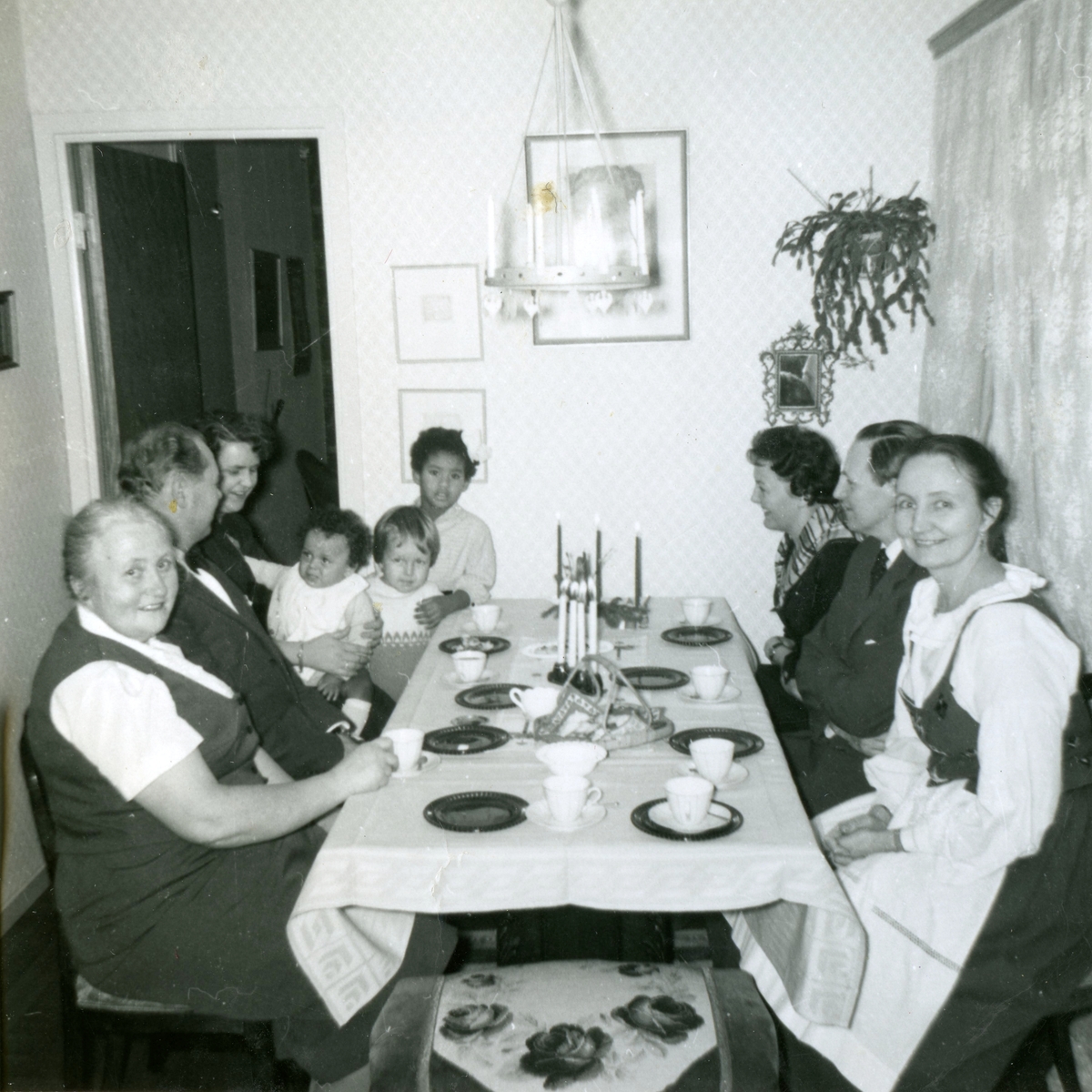 Julen 1958 i Villa Maribo. Sittande främst från vänster: 1. Elin Rothwall. 2. Arne Arvemo. 3. Nellie Kullbring med 4. Mikael Kullbring i sitt knä. 5. Manne Ekman (född 1955). 6. Susanne Kullbring. Sittande främst från höger: 7. Mary Ekman (1920 - 1988). 8. Eje Kullbring. 9. Ebba Arvemo (Marys syster, Mannes moster).