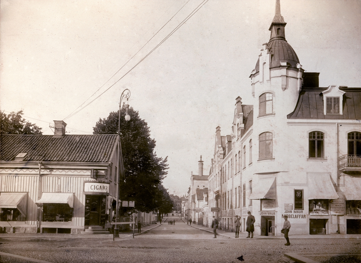 Bäckgatan - Storgatan i Växjö, ca. 1915. Cigarr-Olles och Feukska huset.