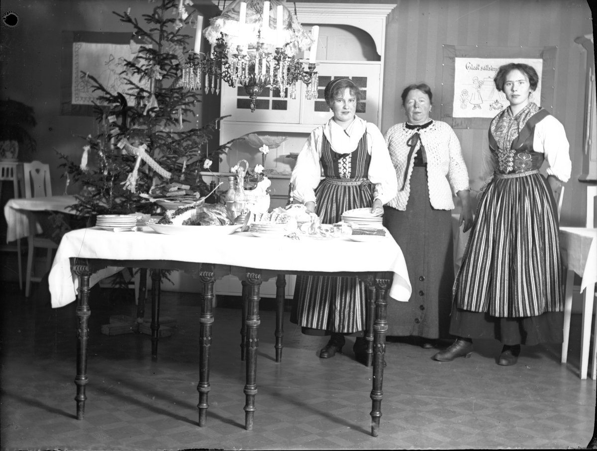 Folkdräktsklädda kvinnor viduppdukat julbord.